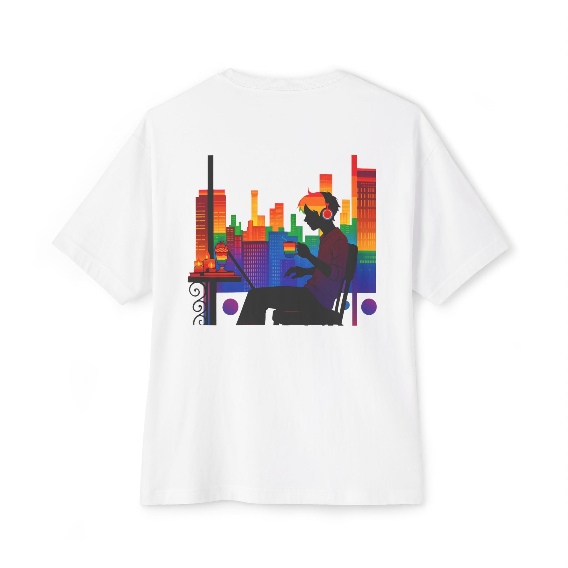Stay stylish and comfortable with this Unisex Oversized Boxy Tee, perfect for a laid-back day or a night out. Featuring a vibrant rainbow cityscape and a cozy café aesthetic, this tee captures the essence of creative energy and chill vibes. The relaxed fit and dropped shoulders create an effortless sense of cool, making it an essential addition to any wardrobe. Ideal for casual outings, music festivals, gaming sessions, coffee shop hangs, or lounging at home, this versatile tee complements any lifestyle. Perfect for fashion enthusiasts, artists, gamers, and trendsetters alike, it also makes a thoughtful gift for birthdays, Pride celebrations, holidays, or back-to-school season. Express individuality with comfort and color in one standout piece.